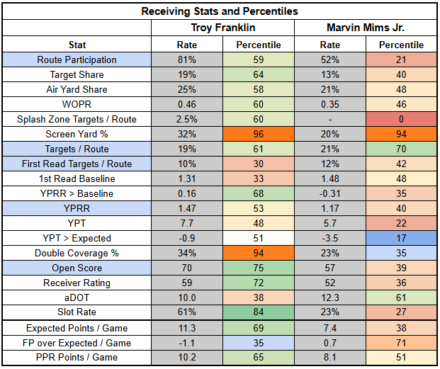 Franklin's target profile isn't impressive, but like Mims, he's involved in the screen game. He's also drawing double coverage downfield, which is a practical, real-life skill that should help keep him on the field.