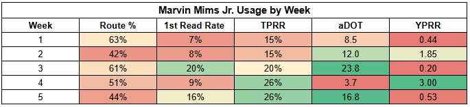 The Jets also don't double-cover all that often. And when in single coverage—either man or zone—Sutton is averaging a 25% TPRR and a 2.62 YPRR.