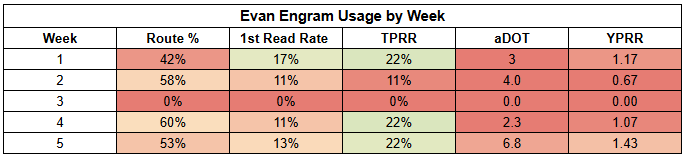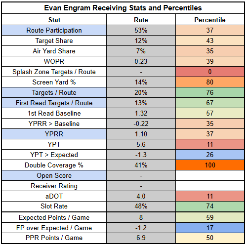 Evan Engram has a solid 20% TPRR, but he just isn't on the field enough to be a reliable fantasy option.