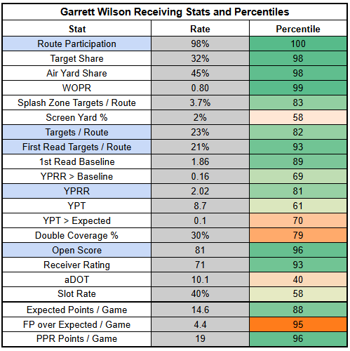 For the Jets, the receiving game is named Garrett Wilson. Wilson is dominating targets by getting open at an elite rate and being the only WR with a pulse on the Jets.