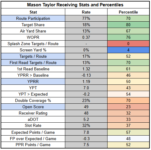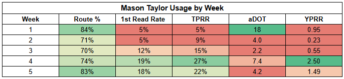 Mason Taylor's role in the offense has been growing in recent weeks, and he is starting to look like a reliable-ish play.