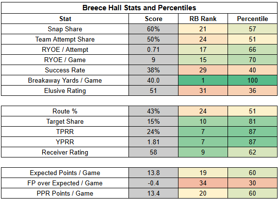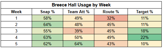 With Braelon Allen out, Breece Hall saw his first impressive carry share of the year, with a solid 64% mark. He also maintained a solid role in the passing game.