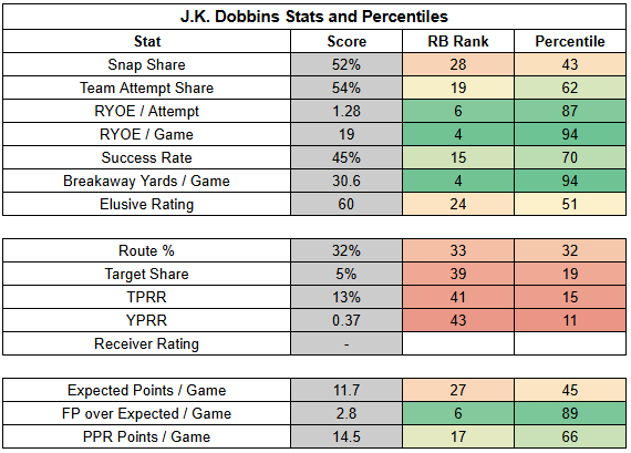 This is a good setup for JK Dobbins, who has been the Broncos' primary ball carrier this year and has run well. He has a TD-dependent fantasy profile, but he has a good chance to hit paydirt here. He's a high-end RB3.