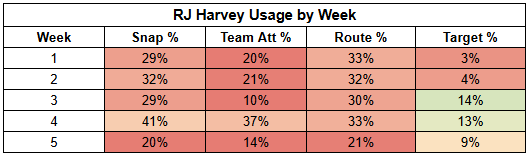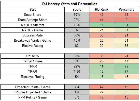 RJ Harvey remains in a rotational role and actually took a step back in workload against the Eagles last week.