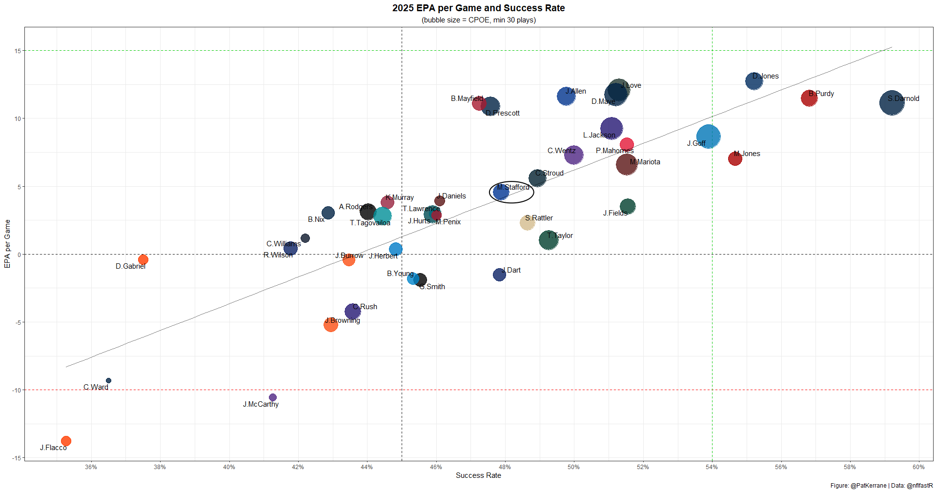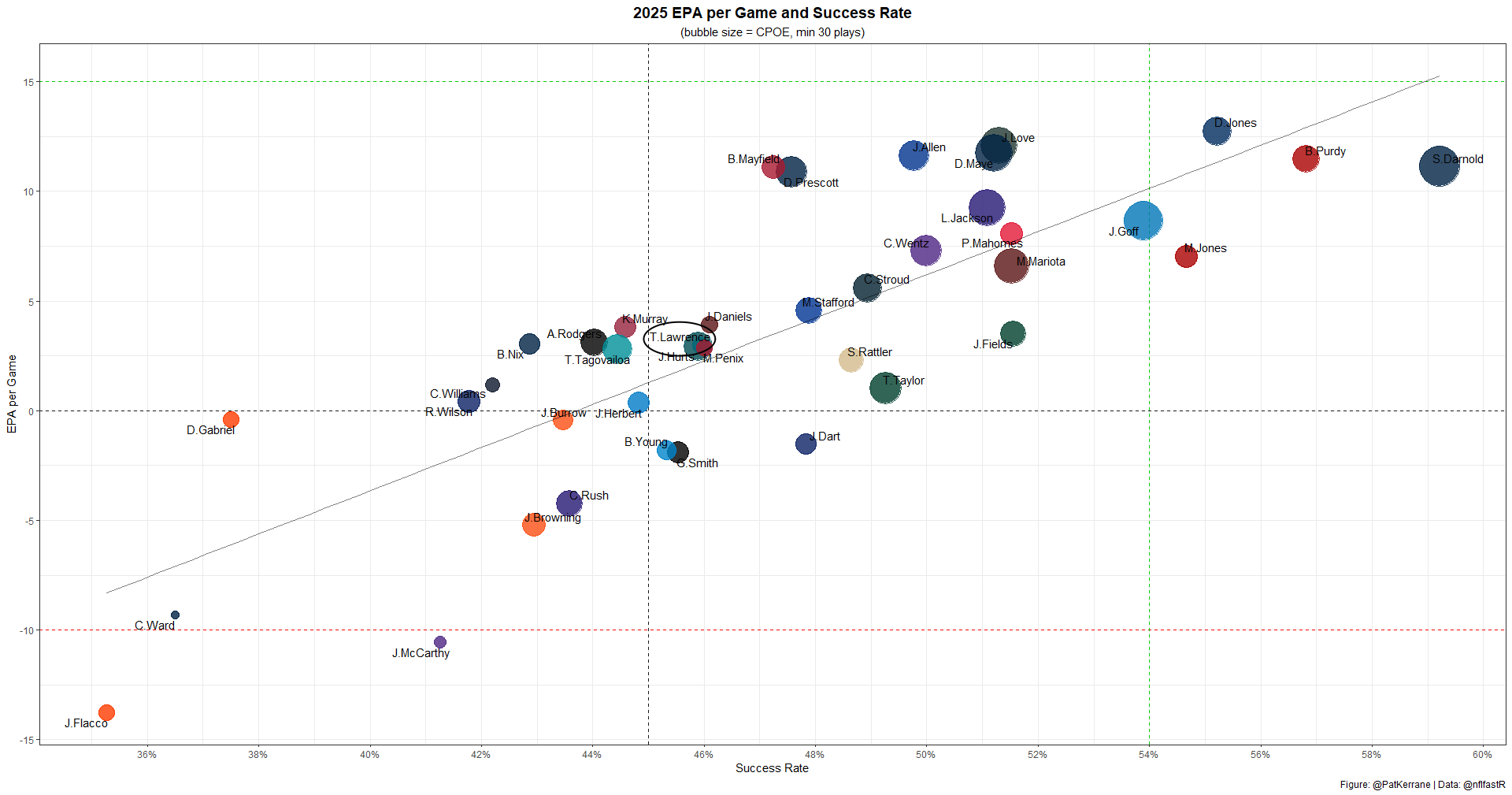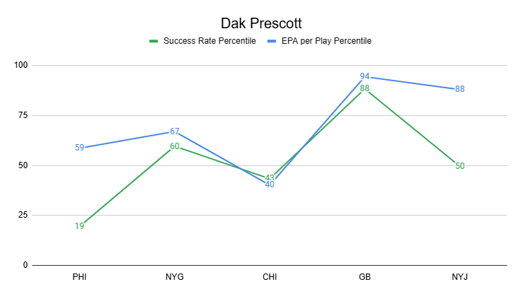 Dak Prescott has played very well this year, ranking QB8 with 10.9 EPA per game, close to MVP-level efficiency. His 47% success rate is more good than elite, but he's still been very impressive.