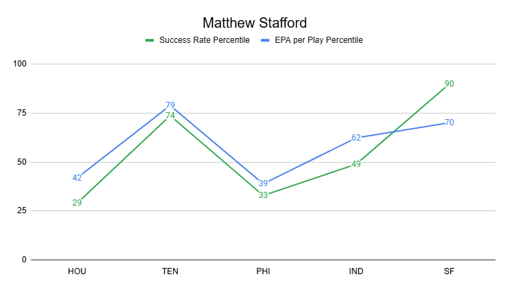 Against the Texans and Eagles, Stafford has struggled. But he was excellent against the Titans and 49ers.