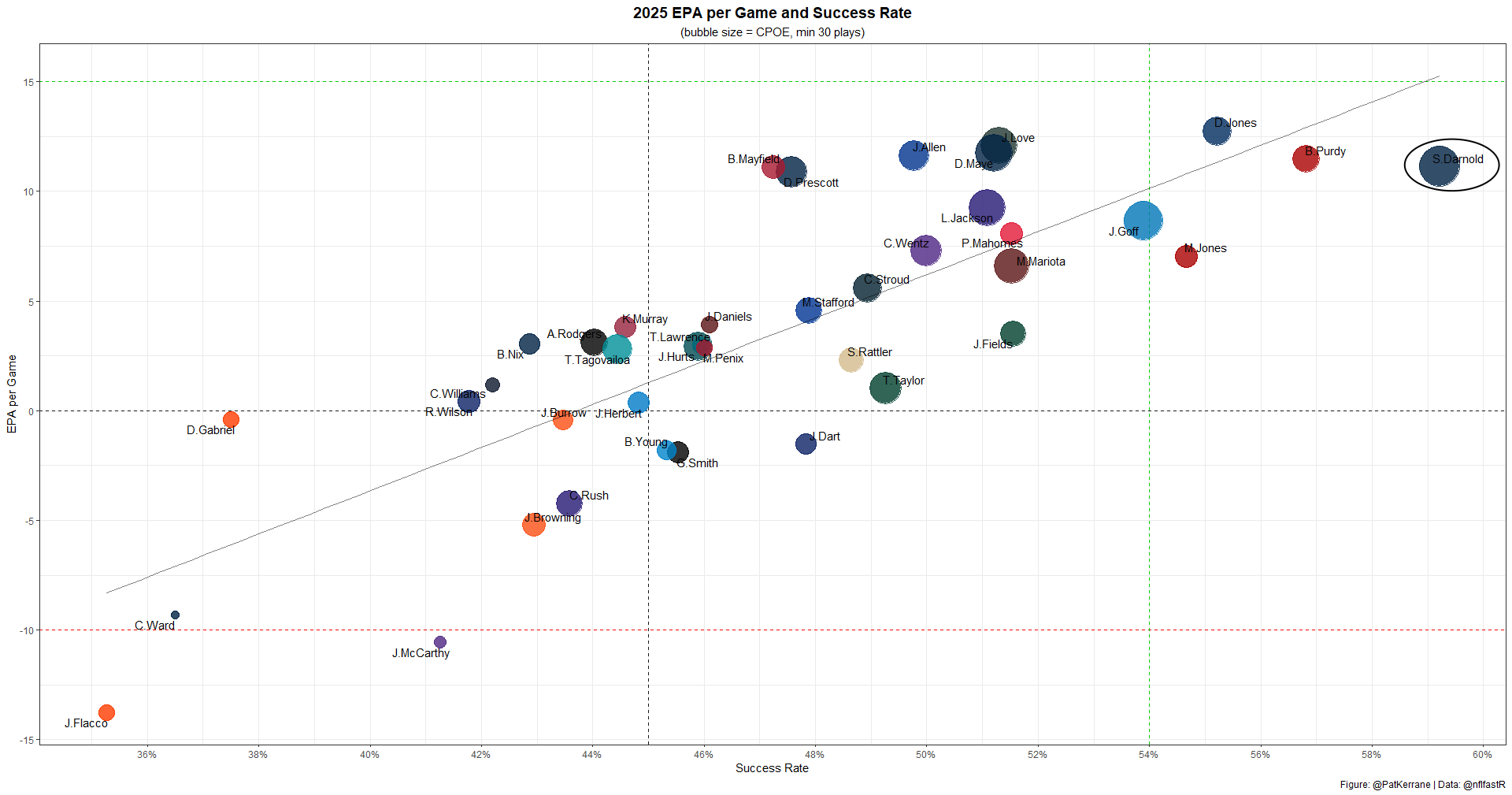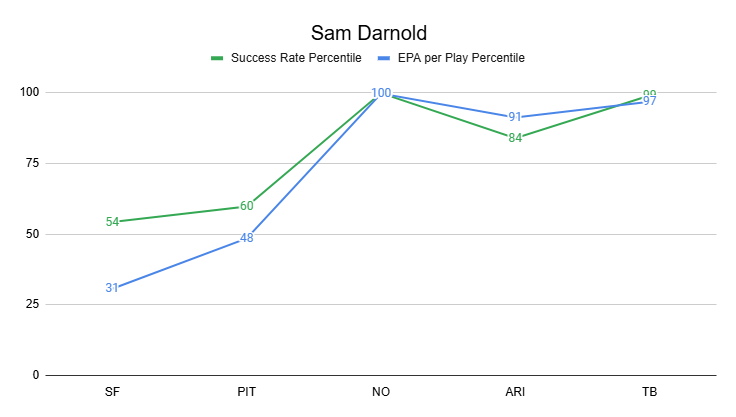 Darnold is likely to fall off from his recent level of play at least slightly on variance alone. But it's always a great sign to see a QB playing this well.