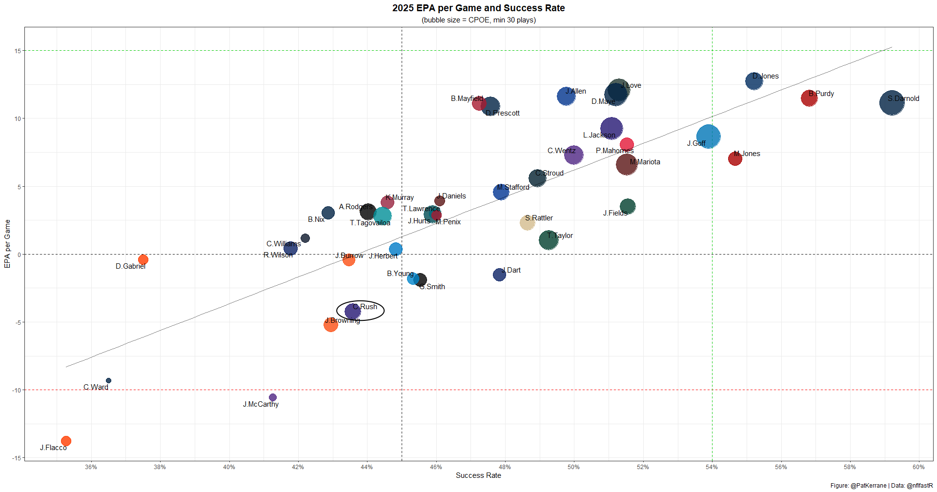 Per Kevin Cole, Rush lost 16.5 EPA—what data scientists refer to as a "shitload"—on three interceptions and a sack.