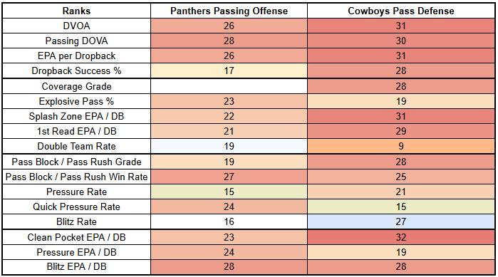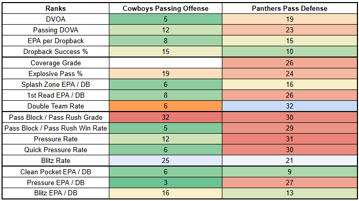 Dallas' playstyle against the Jets is notable because, heading into Week 6, they face a weak Panthers pass rush and a Panthers offense that has been hit-or-miss this year.