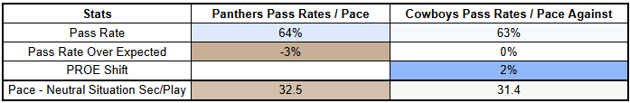 And Carolina would not be the first team to go run-heavy against the Cowboys. The only teams to have a positive PROE against Dallas are the Giants and the Jets (the Jets!).
