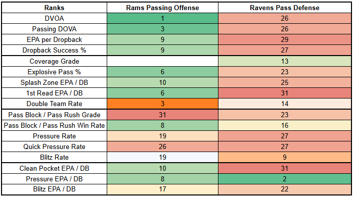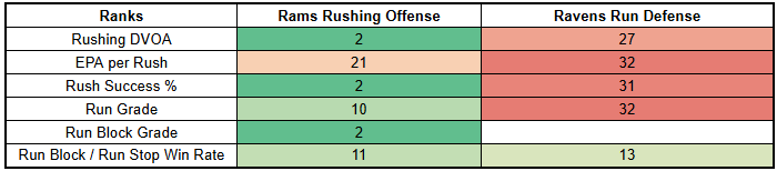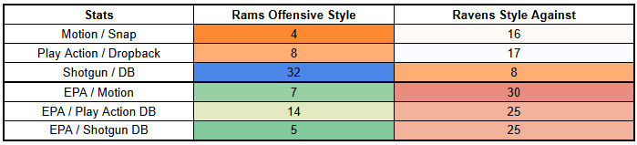 The Ravens have also been highly susceptible to motion and play action, which the Rams deploy at high rates and with success.