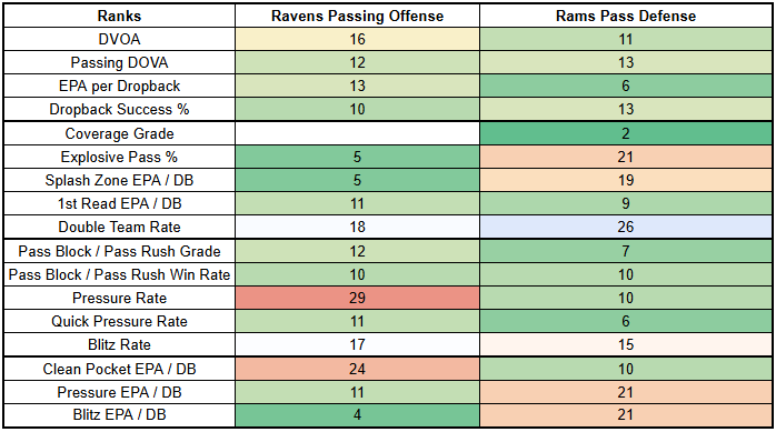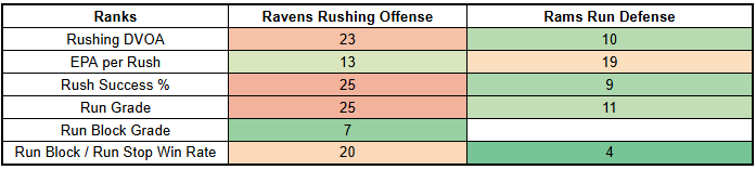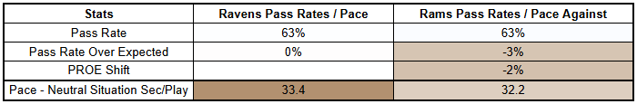 Rams opponents are averaging a -3% PROE against them with a 2% PROE shift to the run. Los Angeles look like a run funnel. This is another data point in favor of the idea that the Ravens will be conservative here.
