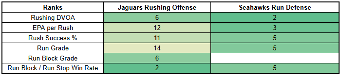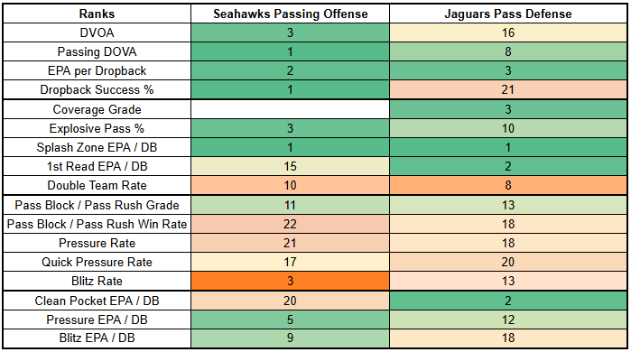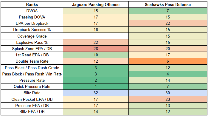 The only issue is overall droback volume. So let's talk about that. The Seahawks would prefer to play things through the run game. But they may not be in charge here as slight road underdogs. And as we'll get to, the Seahawks' secondary is very banged up, and the Jags' offensive line—if healthy—looks capable of holding up fairly well in pass protection.