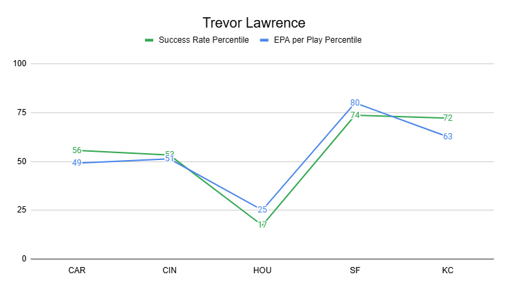 As part of their last-minute win over the Chiefs, Lawrence turned in his second-most efficient game of the season.