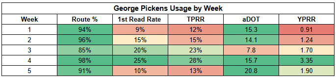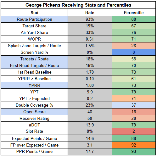 George Pickens is coming off a quieter game against the Jets, seeing just a 13% TPRR.