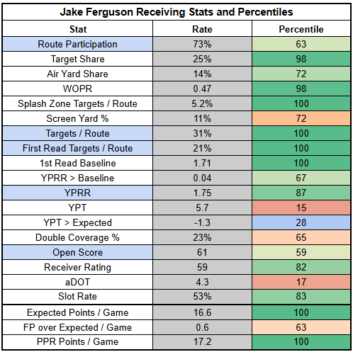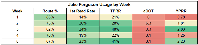 If the Cowboys can protect better this week, Ferguson might be less of a focal point. At the same time, Ferguson's worst TPRR of the year is 21%. With Lamb still working back, Ferguson is a safe bet for targets.