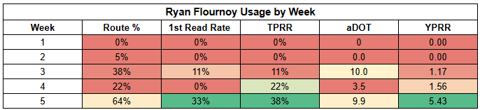 Ryan Flournoy is coming off a 6/114/0 receiving line, on a 31% target share. He didn't lead the team; Jake Ferguson did (35%). But it was still an impressive breakout game.