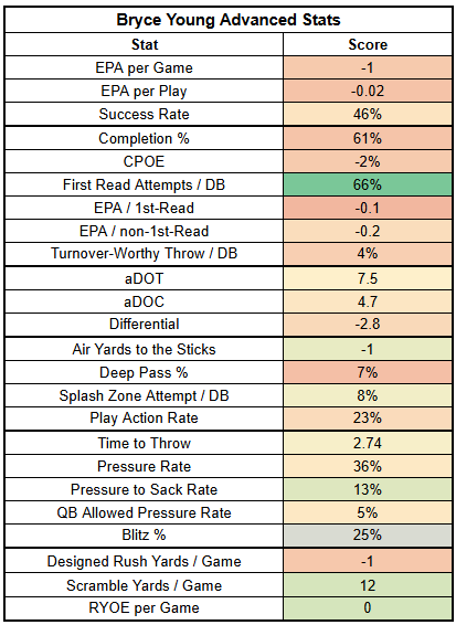 In EPA per game, Young ranks QB34, ahead of only Geno Smith, Cooper Rush, Jake Browning, Cam Ward, JJ McCarthy, and Joe Flacco.