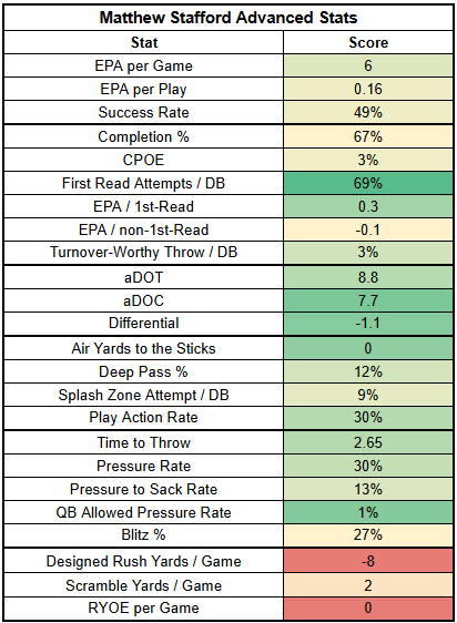 If you can't get pressure against Stafford, you at least need to be able to take away his first read. Stafford is attempting first-read throws at a very high rate and cooking on those throws.