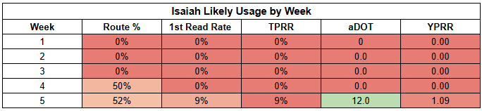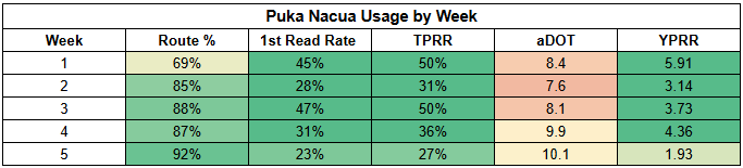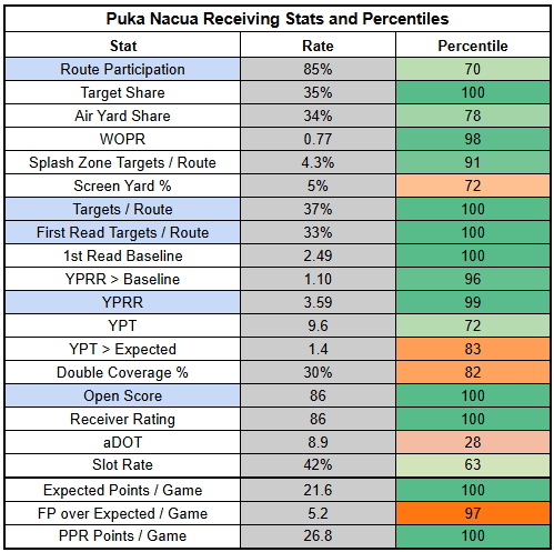 Nacua has an insane 33% first-read target rate. His lowest mark of the season is an elite 23%. His TPRR numbers are also astronomical—he's hit 50% twice.