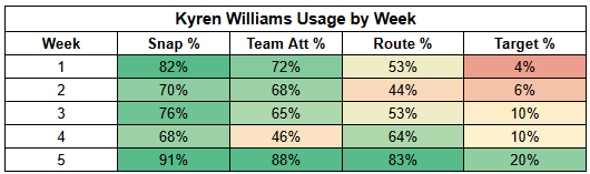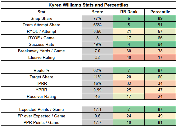 The silver lining here is that these massive negatives aren't something we should expect every week, especially when Rush isn't facing an elite pass rush like he was last week.