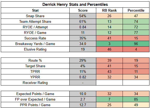 Derrick Henry has been explosive this year, but his success rate is a major concern at this point. Sure, maybe when Jackson is back, it won't seem like a big issue. But if you're looking to lean on an RB as the engine of a one-dimensional offense, you'd like him to have a better success rate than Zach Charbonnet, especially if he doesn't catch passes. Henry is a volume-based RB2.