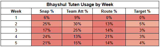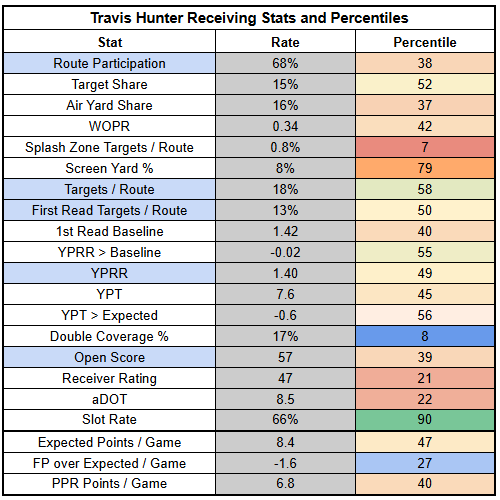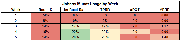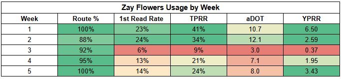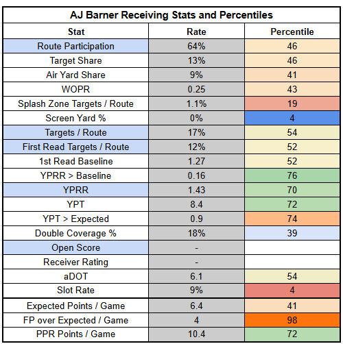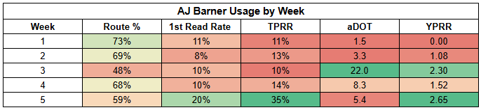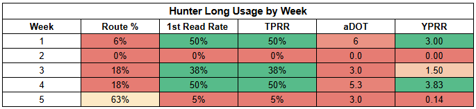 Unfortunately, Hunter's underlying target stats were pretty weak. He did post his second-highest route participation of the season, which is nice to see. But he just hasn't been the focal point on offense that I was expecting.
