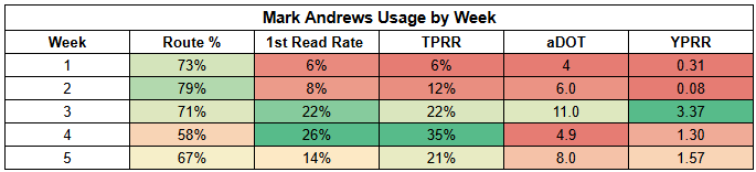 At tight end, Mark Andrews had his route participation tick up last week.