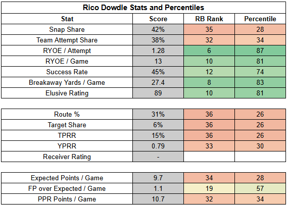 Rico Dowdle snapped his finger and turned his weak, small-sample efficiency chart into a high-end, still-pretty-small-sample efficiency chart. He now looks like an explosive runner. And he's been consistent all season.