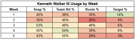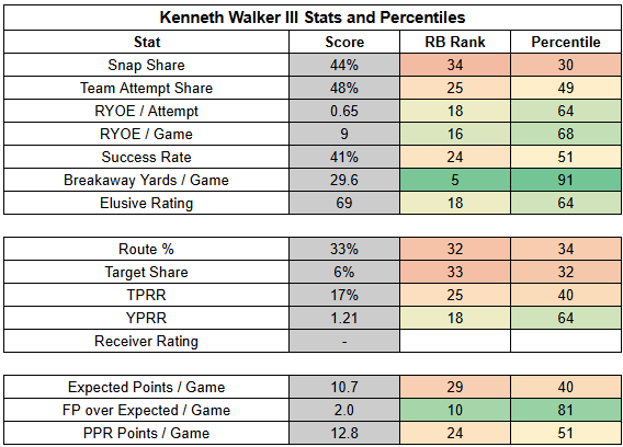 Nice guy Kenneth Walker leads the team in friendzone carries, but his role is severely limited by Charbonnet's grasp on the Seahawks' backfield.