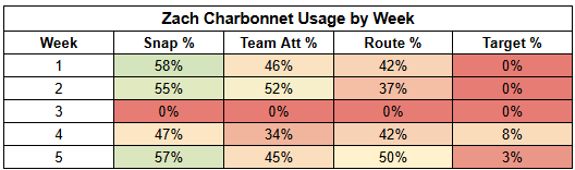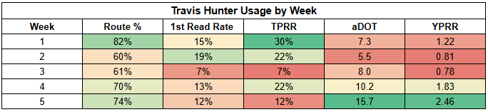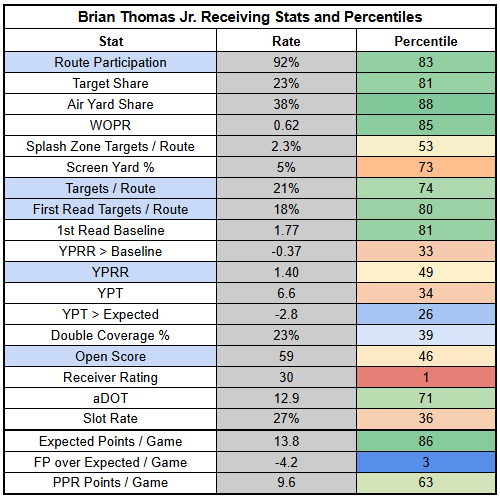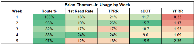 Against Kansas City, we finally saw Brian Thomas get going a little bit with a 4/80/0 receiving line on six targets. Ironically, Thomas has his weakest first-read target rate of the year and an unimpressive 18% TPRR. But we needed proof of concept on his efficiency, and we got it.