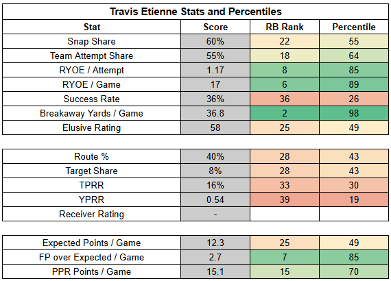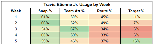 In the backfield, Travis Etienne gets a tough matchup and is coming off his lowest carry share of the season.
