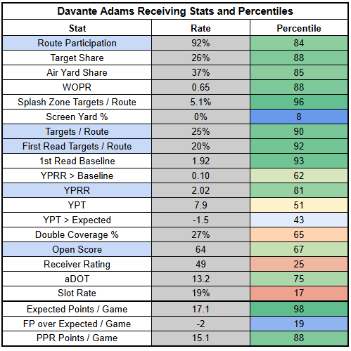 Adams has been good against zone this year, posting a 22% TPRR and 1.91 YPRR, but he's been significantly better against man, with a 33% TPRR and 2.38 YPRR. Combined with the quality of the man coverage he could face here and that the Ravens' lack of a pass rush should help generate big play opportunities... this is a true spike week setup for Adams. He's a WR1.