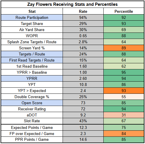 With the Ravens likely fighting game script, and with Rush very unlikely to be effective, this is a very tough spot for the Ravens' receivers. Zay Flowers is doing what he can, though. Against the Texans, he willed his way to a 5/72/0 receiving line with a 14.4 YPT.