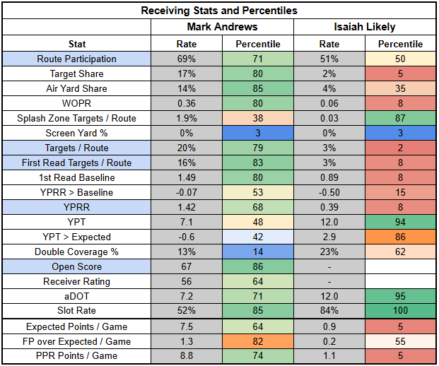 Meanwhile, Isaiah Likely was in a very similar role to Week 4.