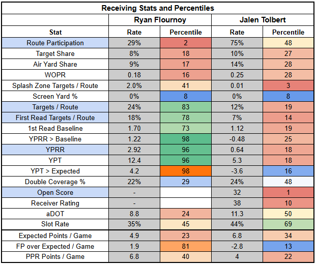Even with Jalen Tolbert (91%) easily leading Flournoy in route participation last week, Flournoy is the much more interesting dart throw.