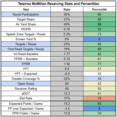 This year, that receiver is very clearly Tetairoa McMillan, who is dominating targets and producing efficiently.
