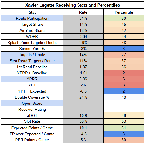 With Xavier Legette back in the lineup last week, he ran a route on 83% of dropbacks. But even in this soft matchup, he's just a dart throw. With Jalen Coker and Ja'Tavion Sanders both logging full practices on Thursday, his target competition will probably be much more significant this week.