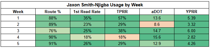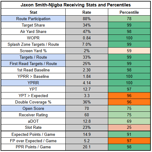But although Smith-Njigba is a lock to drop off in efficiency at some point, the fact that he's efficiently delivering on a 34% target share is the most important thing to consider here.