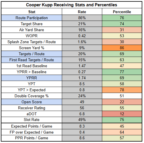 Cooper Kupp's role is far less enticing, but he's still delivering solid efficiency on a 21% target share. He's a WR4 as a bet that the Jaguars push the Seahawks.