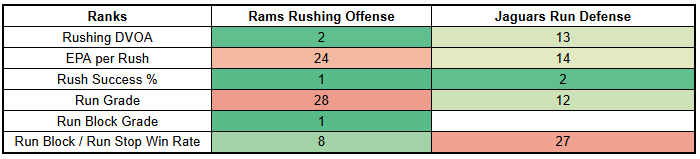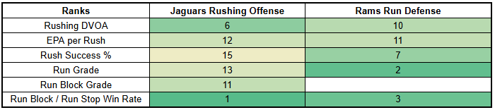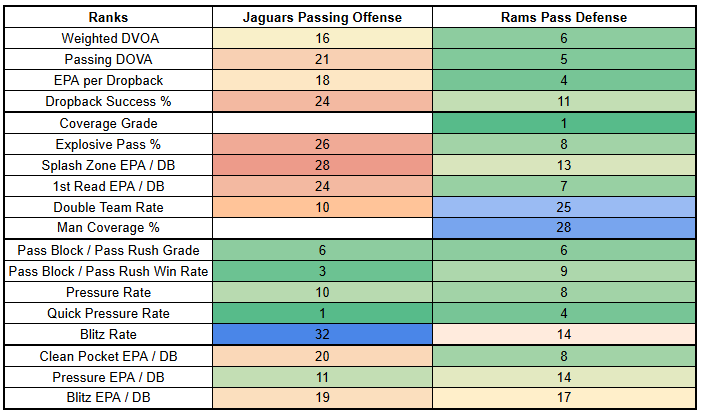 The Jaguars' offensive line will be put to the test again here. They face an elite Rams pass rush. The Rams are also playing very well in coverage. This is a tough passing matchup.