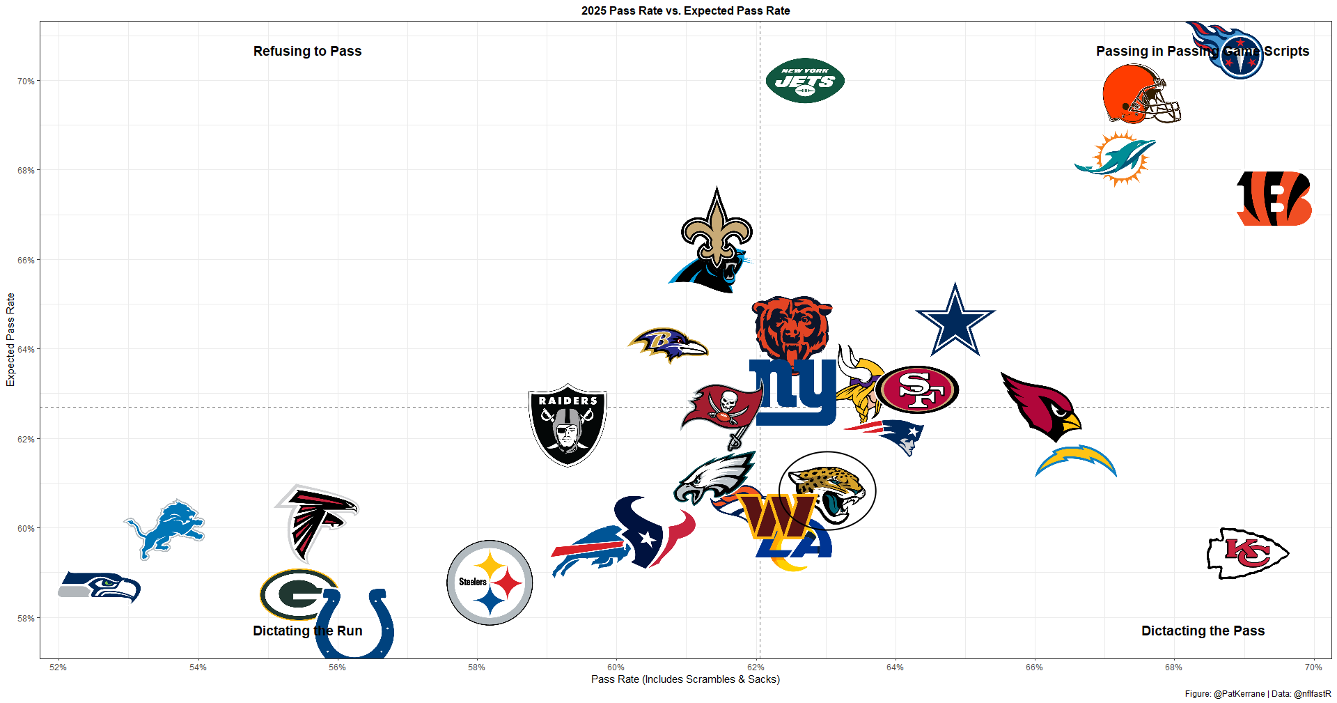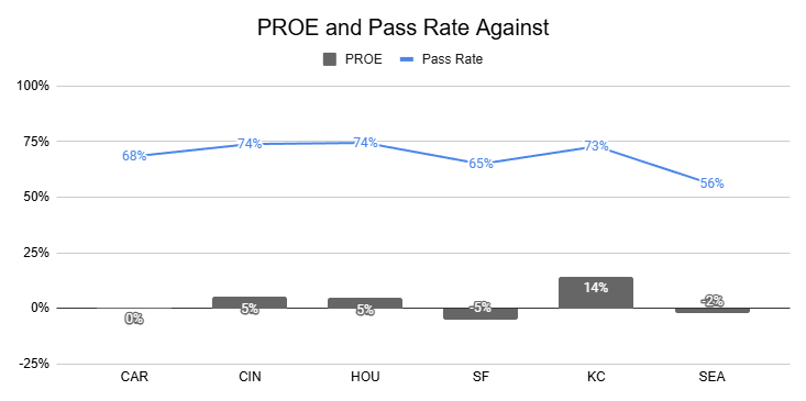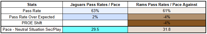 With a 2% PROE, the Jaguars have had a slight lean to the pass this year, and like the Rams, they've been pass-first from generally positive game script. They haven't been forced to the air; they look like a balanced team, but one with a genuine tilt to the pass.