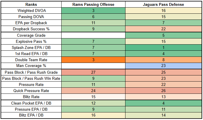The Jaguars' pass rush looks pretty weak, which is welcome news for a Rams team that is allowing quick pressure at a high rate and will be without RT Rob Havenstein this week.