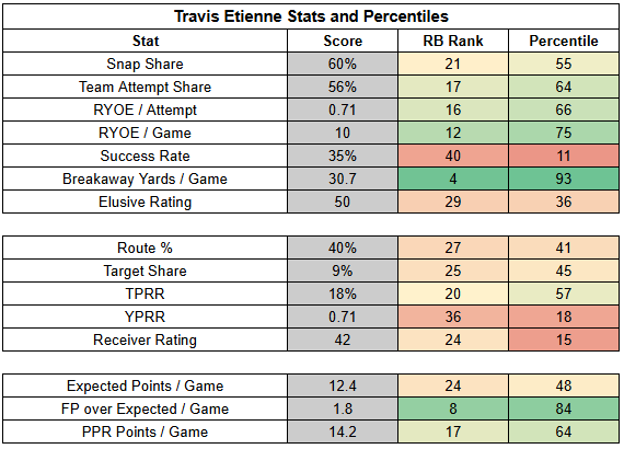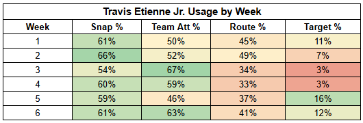 Etienne is ceding a bit of work to Bhayshul Tuten, but he is consistently seeing starter-level workloads, and his receiving role has actually improved over the last two weeks. Etienne is a low-end RB2.