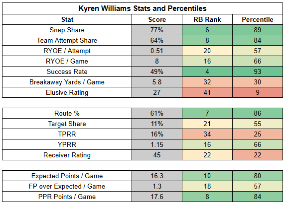 Williams has been a consistent runner this year, but, as you know, he's not much of a breakaway runner. He delivers value by accumulating chunk runs and scoring TDs.