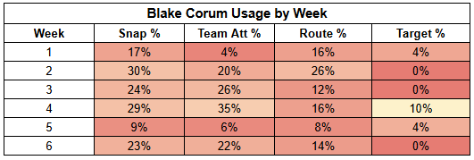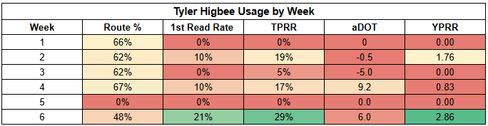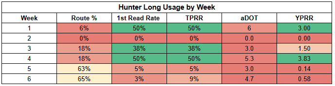 Hunter's profile is increasingly difficult to make excuses for. His playing time isn't ideal, but it's not awful. The issue is he just doesn't seem to be a big part of the game plan, and he's not earning targets at a high enough rate to make up for that. His profile is basically identical to Dyami Brown's right now. It's a bummer. Hunter is a WR4.