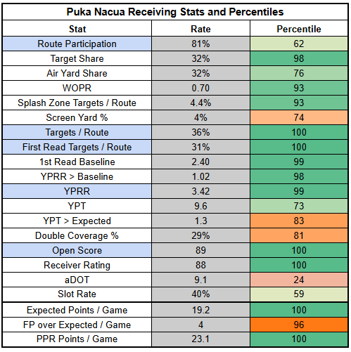 Whittington is a safer bet to take over some of Nacua's role. Atwell has typically been more of a deep threat. But I don't view Puka's role as very replaceable. Or, put differently, the role isn't driving the production; Puka is. Both Atwell and Whittington should see meaningful routes this week, and both are in the WR4 mix.