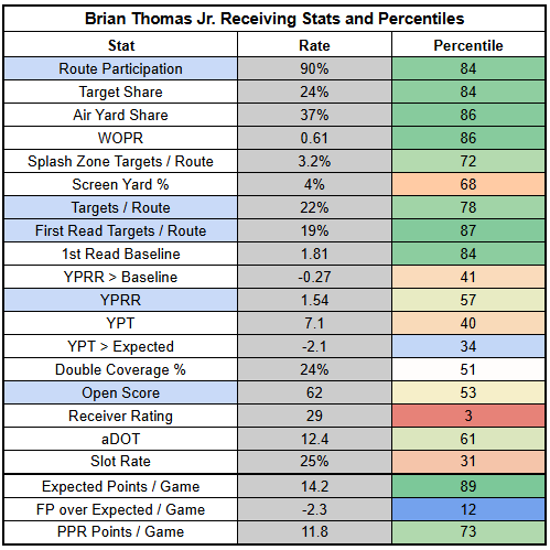In the receiving game, Brian Thomas has been operating as the Jaguars' clear-cut No. 1, and remains a positive regression candidate from both a yardage and fantasy points perspective. This is a tough matchup, but Thomas is a high-end WR2.