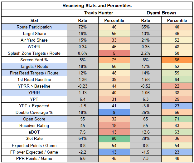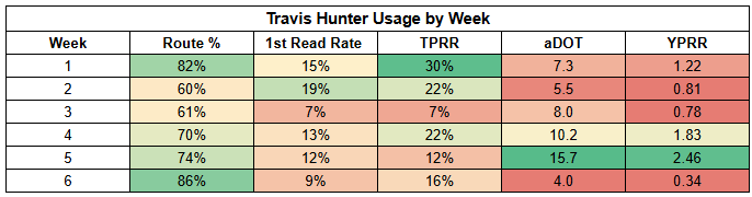 Travis Hunter is coming off his highest route participation of the season, while still playing 22 snaps at cornerback. He might be at more like 76% route participation this week, rather than the 86% mark he hit last week. But worries that he was headed for part-time WR usage, worries created by his low route participation in Weeks 2-3, look to be a thing of the past.