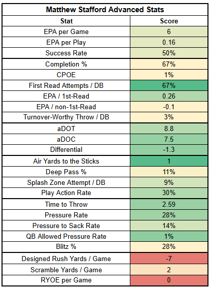 When Stafford is free to operate the Rams offense—when he is protected from the opposing pass rush—he has been very efficient. He is tied with Daniel Jones and Sam Darnold for the highest first-read attempt rate in the NFL. And he's the ninth most efficient QB on plays that end after just one read. As an opposing defense, you do not want to let Stafford execute the primary design of the play. He will pick you apart.